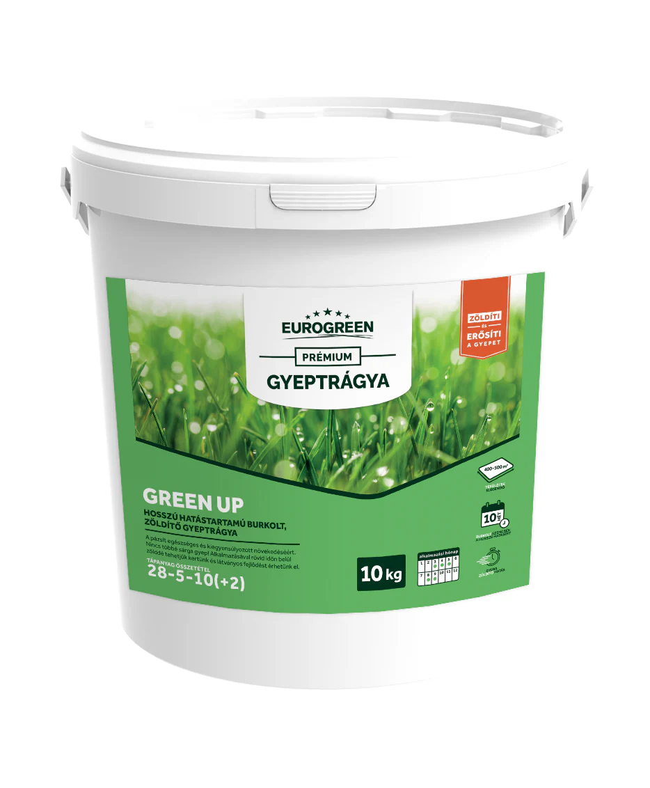 Látványos és gyors fejlődést érhetünk el az Eurogreen Green Up 5 kg gyeptrágya használatával a gyepek intenzív növekedési periódusaiban (március-május és augusztus-szeptember között). A sárgás pázsit néhány napon belül zölddé válik a gyorsan hasznosuló nitrogén formák és a hozzáadott magnézium hatására.